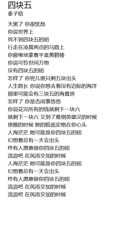 | [00:42.438] | zhǎo bu dào sì kuài wǔ de niū |