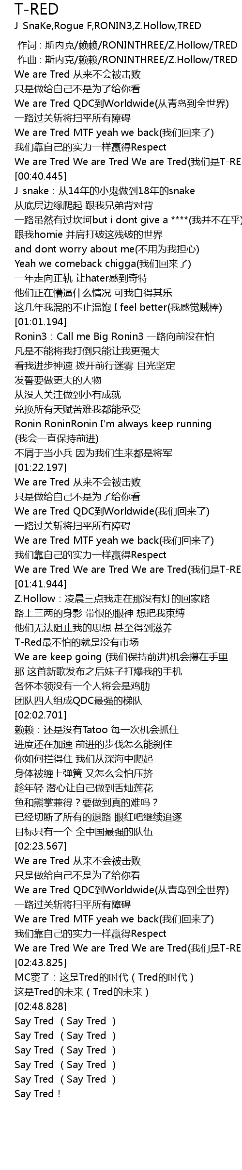 | [01:37.697] | We are Tred We are Tred We are Tred(我们是T-RED) |