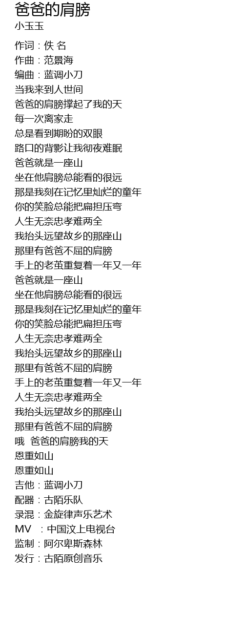 | [00:58.02] | 爸爸的肩膀撑起了我的天 |