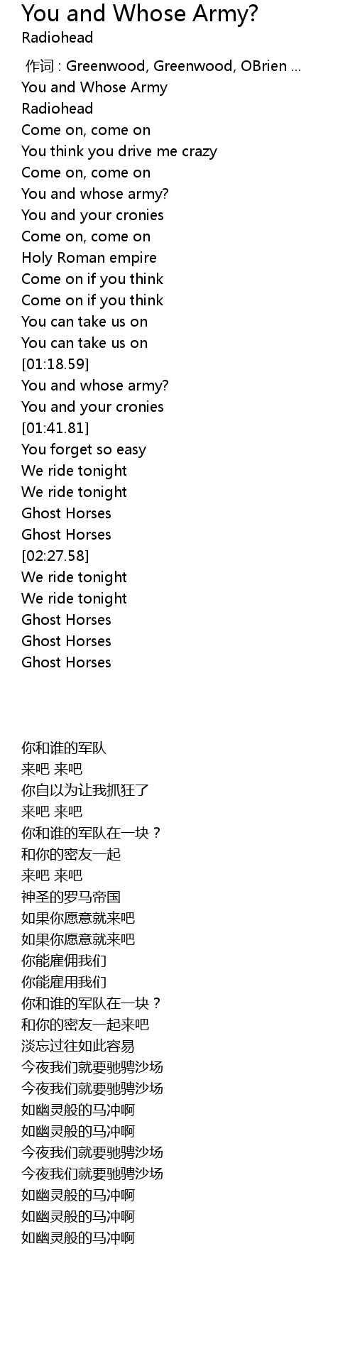 | [00:00.91] | You and Whose Army |