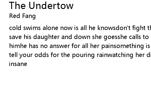 | cold swims alone now is all he knowsdon't fight the water, the undertowcan't save his daughter and down she goesshe calls to him and slips belowshe calls to himhe has no answer for all her painsomething is growing inside her braincan't tell your odds for the pouring rainwatching her die made him insanemade him insane |