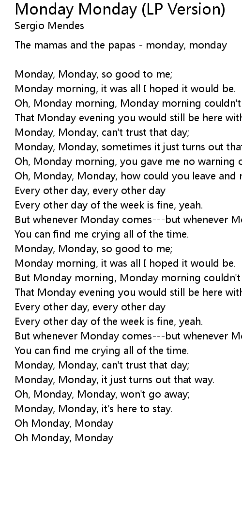 Oh, Monday, Monday, won't go away; |