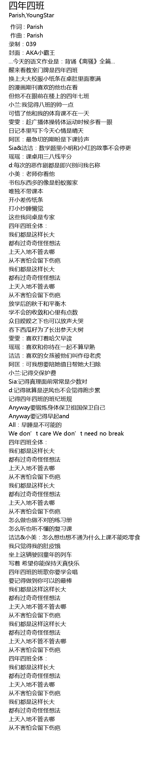 | [00:17.688] | 醒来看教室门牌是四年四班 |