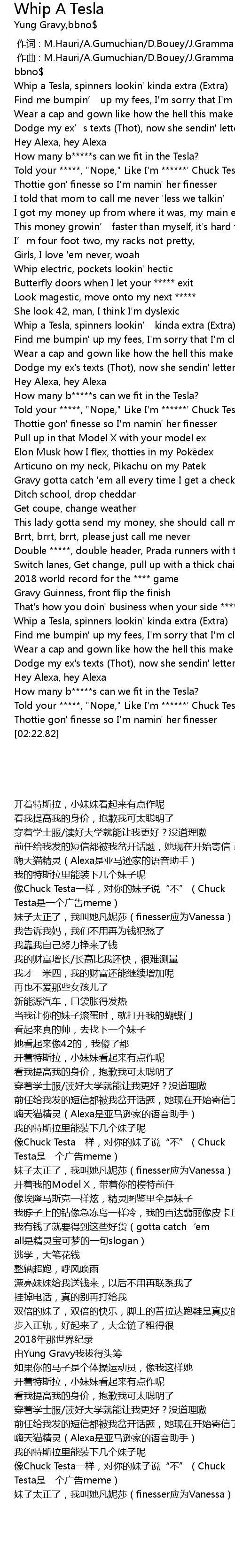 | [00:17.41] | Whip a Tesla, spinners lookin' kinda extra Extra |