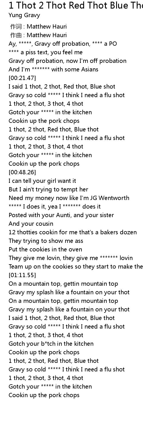 | [00:23.95] | I said 1 thot, 2 thot, Red thot, Blue shot |