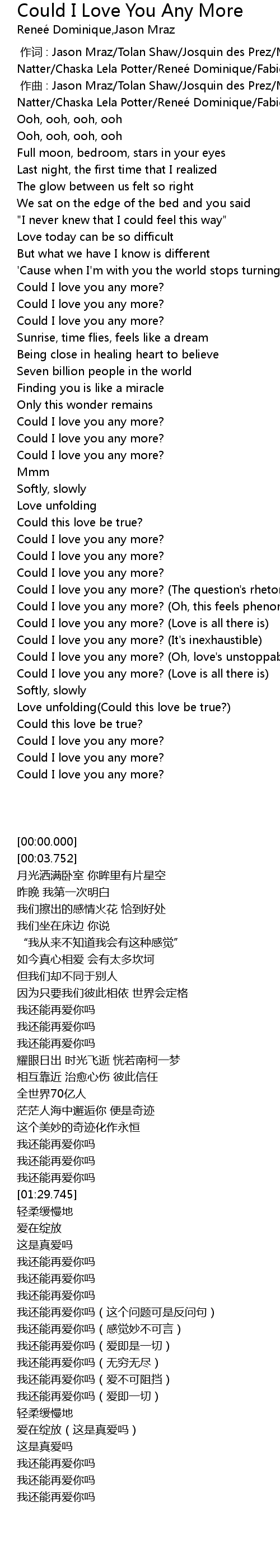 | [02:15.859] | Could I love you any more? It' s inexhaustible |