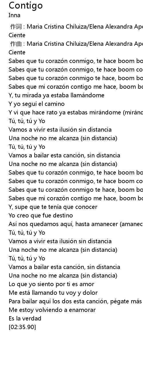 | [00:21.83] | Sabes que mi corazó n contigo me hace, boom boom, contigo me hace |