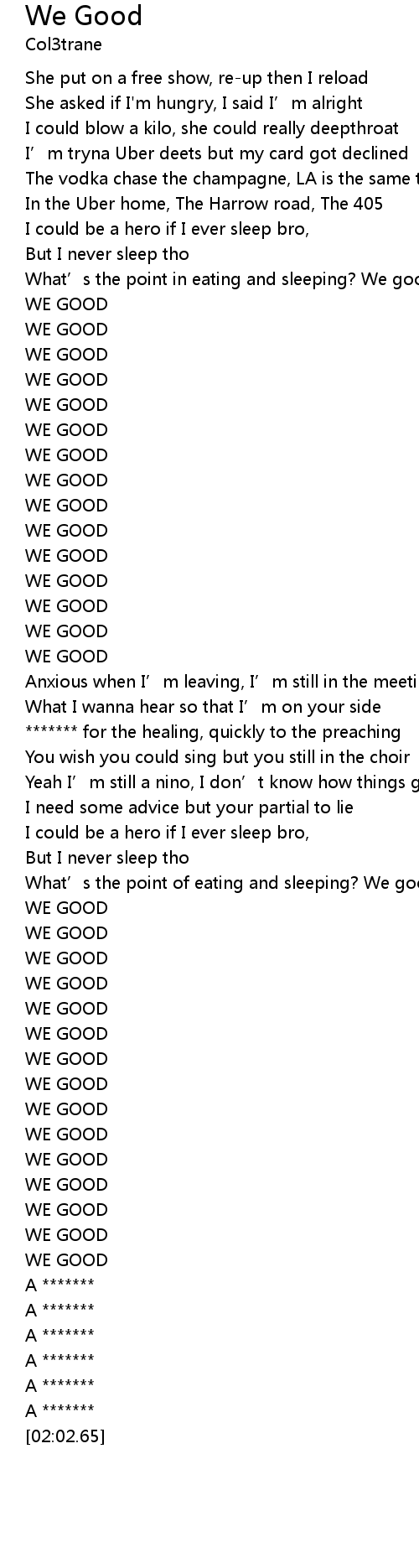| [00:23.71] | What’s the point in eating and sleeping? We good WE GOOD |