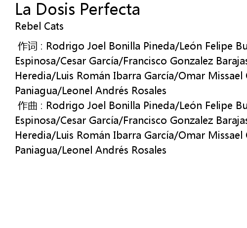 | [00:00.000] | zuo qu : Rodrigo Joel Bonilla Pineda Leo n Felipe Bustamante Dari o Espinosa Cesar Garci a Francisco Gonzalez Barajas Marco Antonio Huerta Heredia Luis Roma n Ibarra Garci a Omar Missael Oseguera Corte s Guillermo Hiram Paniagua Leonel Andre s Rosales |