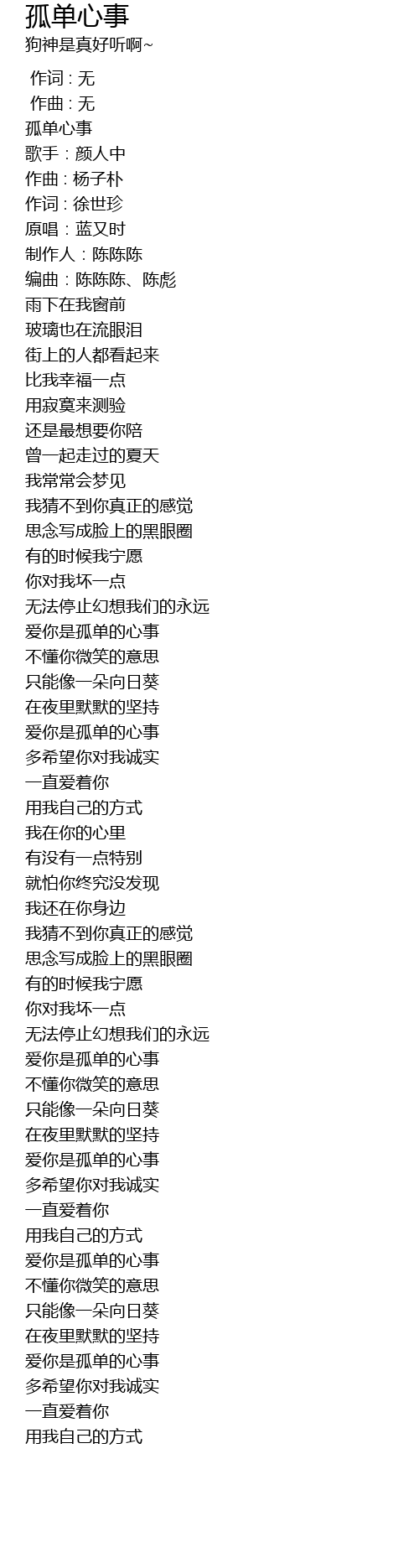 | [01:20.465] | ài nǐ shì gū dān de xīn shì |