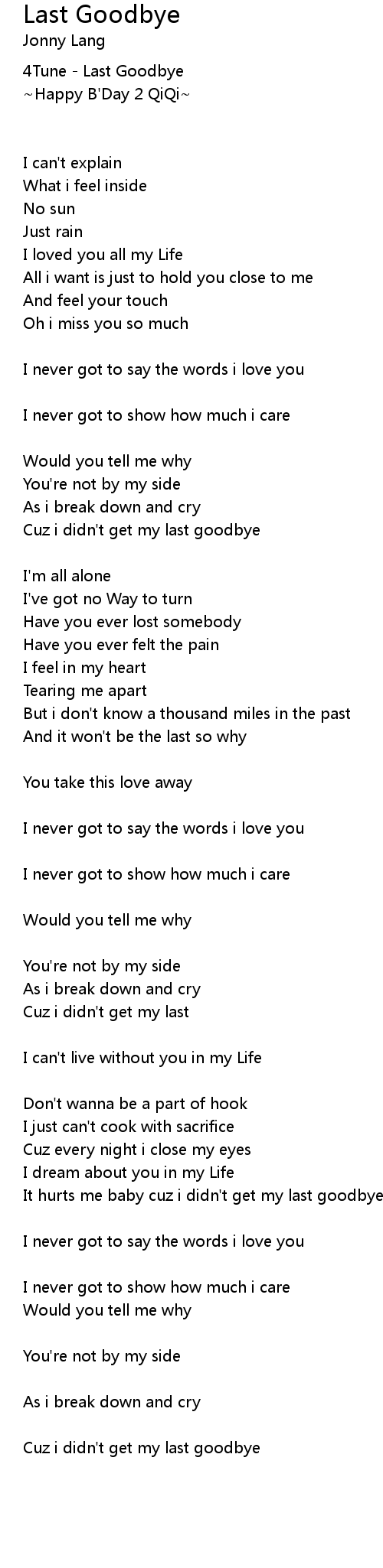 It hurts me baby cuz i didn't get my last goodbye |