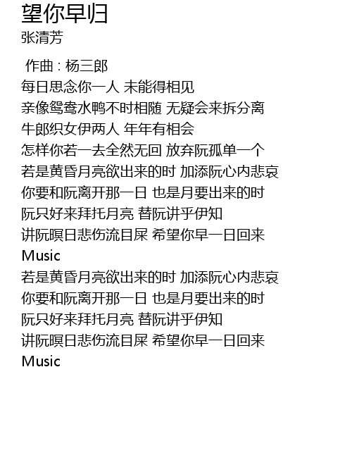 | [03:01.410] | 讲阮暝日悲伤流目屎 希望你早一日回来 |