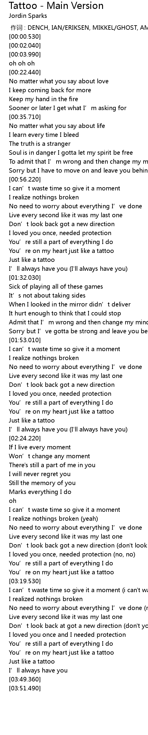 | [03:17.170] | You' re on my heart just like a tattoo |