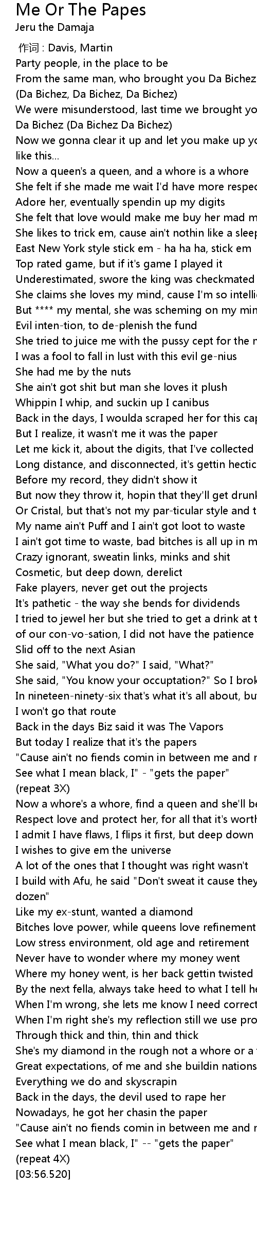 | [03:19.980] | She's my diamond in the rough not a whore or a trick |