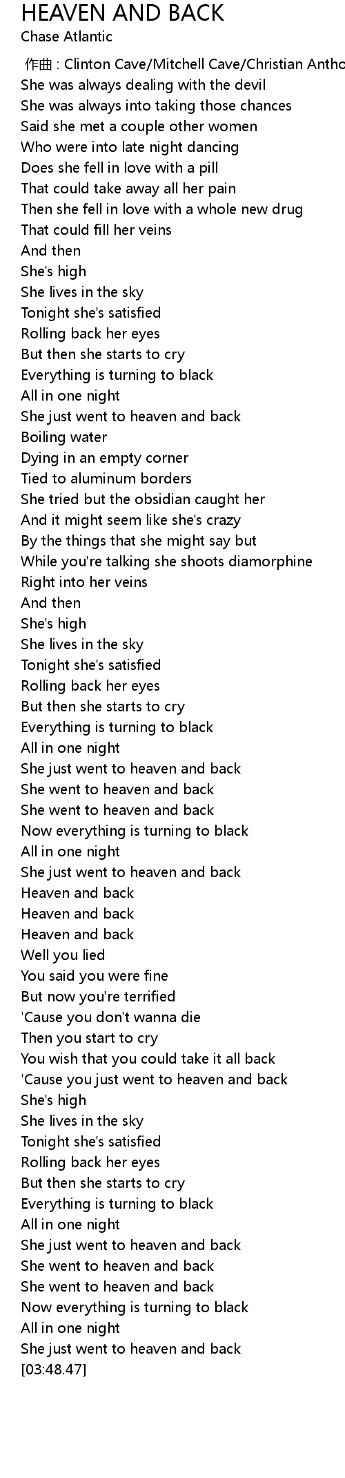 | [03:24.76] | She just went to heaven and back |