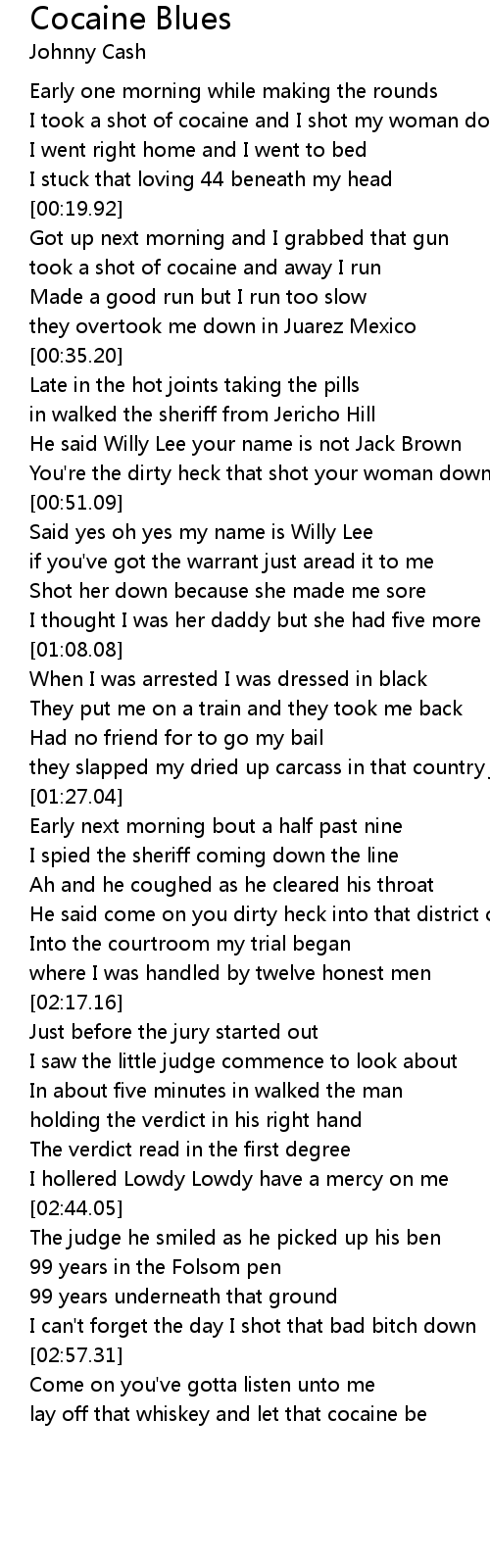 [00:11.25] I took a shot of cocaine and I shot my woman down