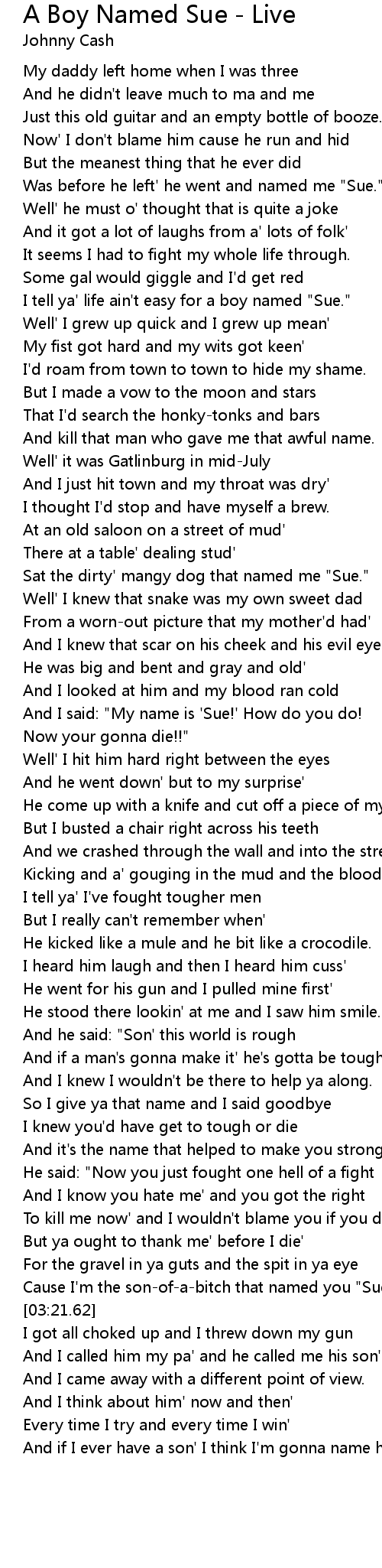 [03:16.93] Cause I'm the son-of-a-bitch that named you "Sue.'"