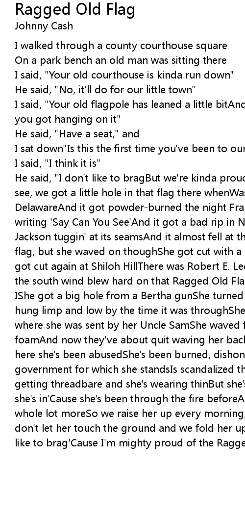 He said, "I don't like to bragBut we're kinda proud of that Ragged Old FlagYou see, we got a little hole in that flag there whenWashington took it across the DelawareAnd it got powder-burned the night Francis Scott KeySat watching it, writing 'Say Can You See'And it got a bad rip in New OrleansWith Packingham and Jackson tuggin' at its seamsAnd it almost fell at the AlamoBeside the Texas flag, but she waved on thoughShe got cut with a sword at ChancellorsvilleAnd she got cut again at Shiloh HillThere was Robert E. Lee, Beauregard, and BraggAnd the south wind blew hard on that Ragged Old FlagOn Flanders Field in World War IShe got a big hole from a Bertha gunShe turned blood red in World War IIShe hung limp and low by the time it was throughShe was in Korea and VietnamShe went where she was sent by her Uncle SamShe waved from our ships upon the briny foamAnd now they've about quit waving her back here at homeIn her own good land here she's been abusedShe's been burned, dishonored, denied, and refusedAnd the government for which she standsIs scandalized throughout the landAnd she's getting threadbare and she's wearing thinBut she's in good shape for the shape she's in'Cause she's been through the fire beforeAnd I believe she can take a whole lot moreSo we raise her up every morning, we take her down every nightWe don't let her touch the ground and we fold her up rightOn second thought, I do like to brag'Cause I'm mighty proud of the Ragged Old Flag |