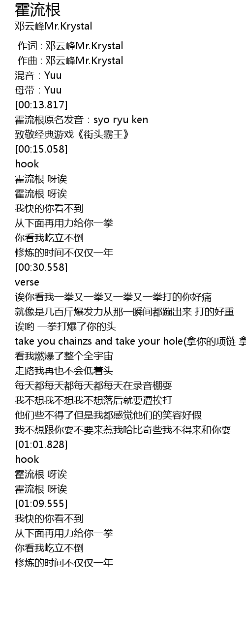 | [00:14.318] | 霍流根原名发音:syo ryu ken |