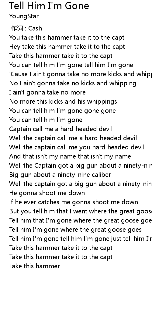 | [02:32.20] | Tell him I'm gone tell him I'm gone just tell him I'm gone |