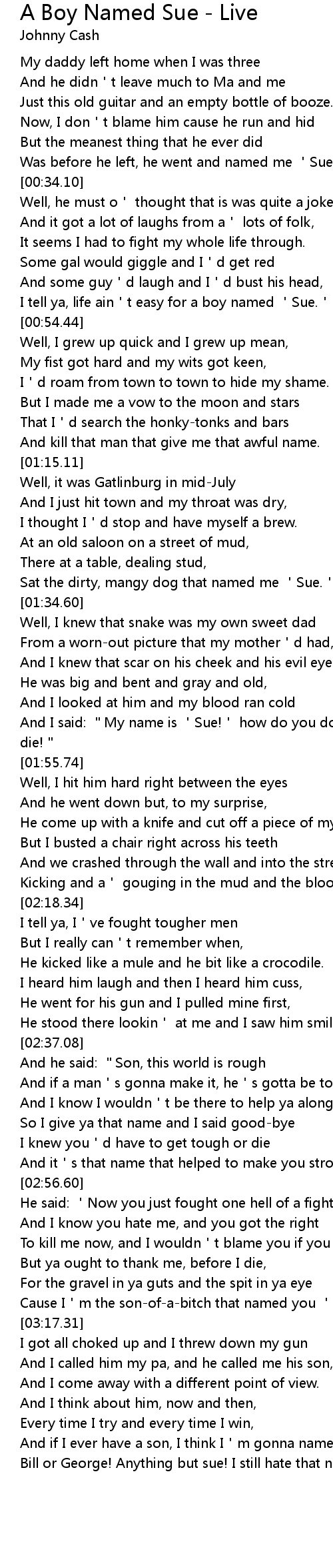 | [03:13.36] | Cause I'm the son-of-a-bitch that named you 'Sue'.' |