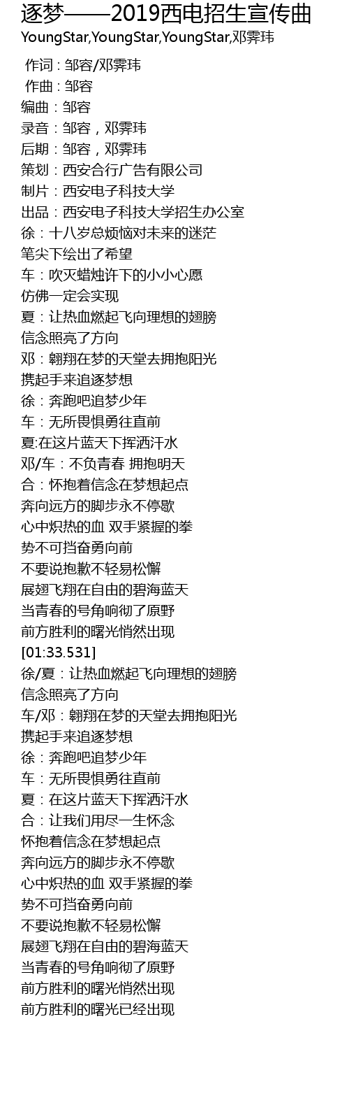 | [01:54.317] | 徐/夏:让热血燃起飞向理想的翅膀 |
