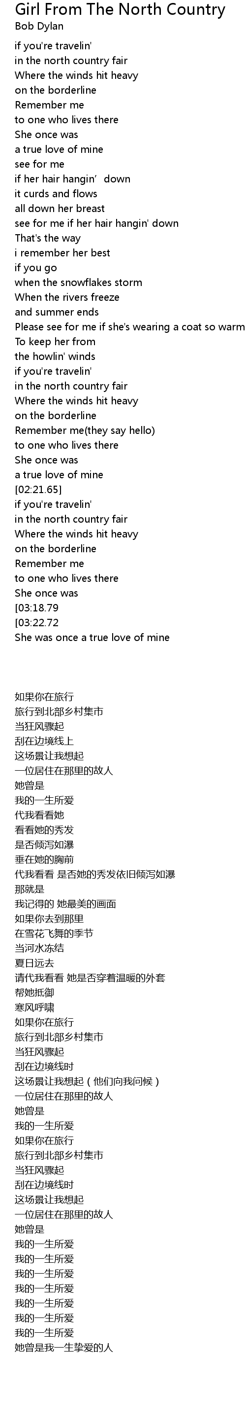 | [01:34.79] | Please see for me if she's wearing a coat so warm |