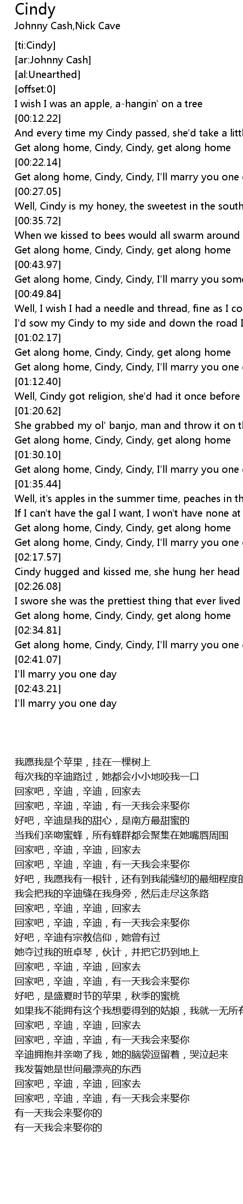 | [02:36.20] | Get along home, Cindy, Cindy, I'll marry you one day |