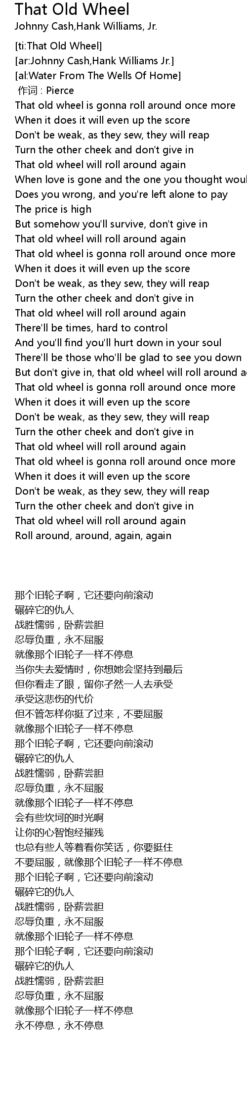 | [00:47.72] | That old wheel is gonna roll around once more |