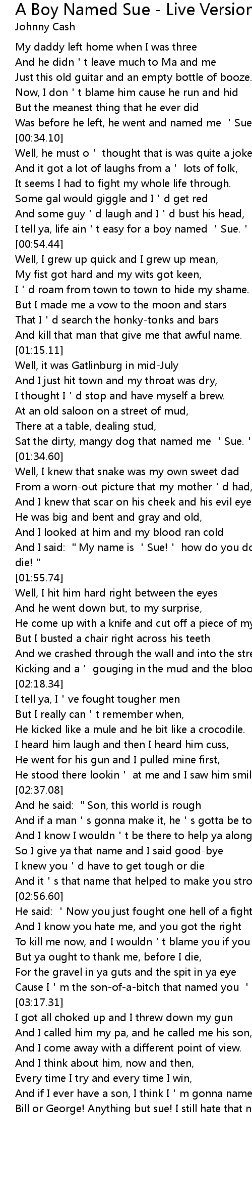 | [00:50.49] | I tell ya, life ain't easy for a boy named 'Sue.' |