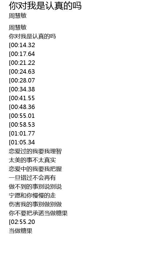 | [01:55.21][00:41.55] | nǐ duì wǒ shì rèn zhēn de ma zhēn de ba |