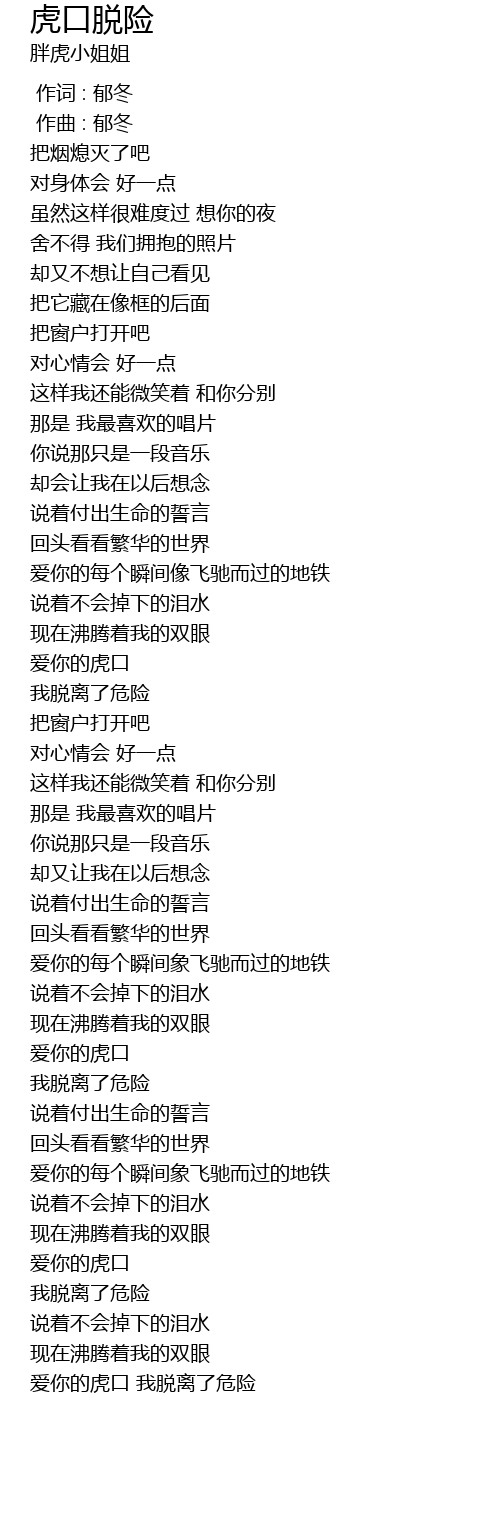 | [03:39.839] | ài nǐ de hǔ kǒu wǒ tuō lí le wēi xiǎn |