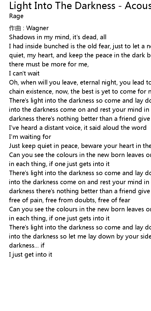 | There' s light into the darkness so come and lay down by my side there' s light into the darkness come on and rest your mind in my arms let me enlight your darkness there' s nothing better than a friend give light into my darkness... | |