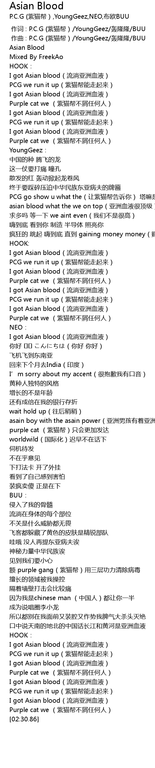 | [02:15.00] | I got Asian blood liú tǎng yà zhōu xuè yè |