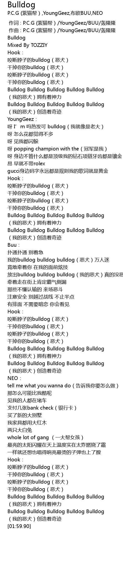 | [00:57.49] | 我的bulldog bulldog bulldog(恶犬)万人迷 |