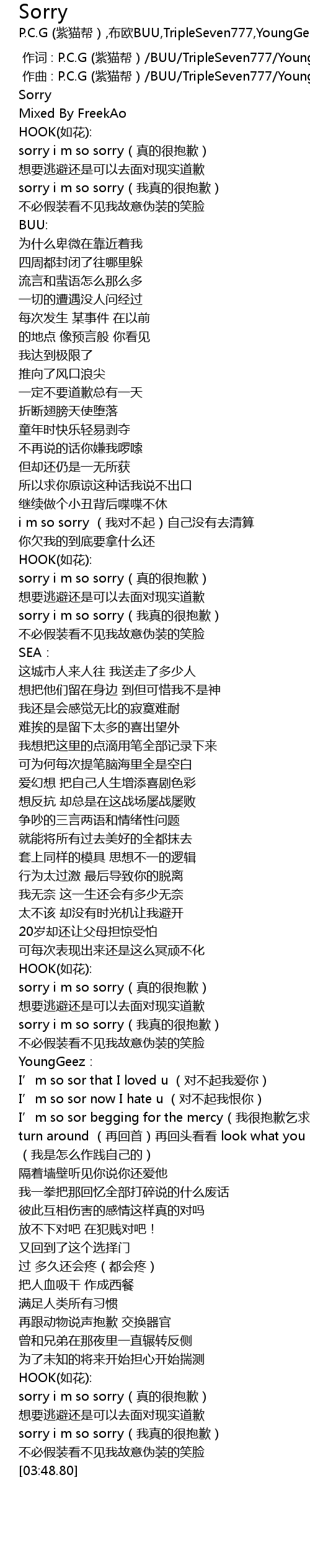 | [03:35.79] | sorry i m so sorry wǒ zhēn de hěn bào qiàn |