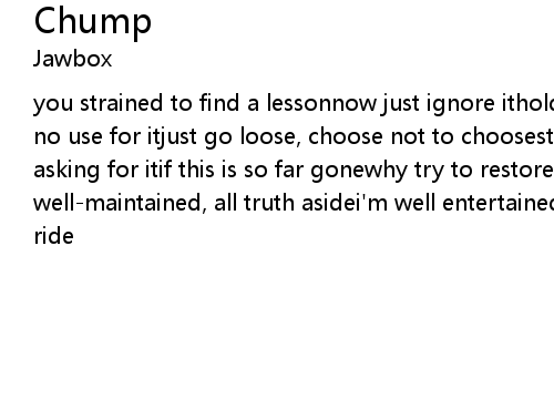 | you strained to find a lessonnow just ignore ithold on to your heartbut there's no use for itjust go loose, choose not to choosestaring at that windowmaybe i'm asking for itif this is so far gonewhy try to restore itwith smile well-maintained, all truth asidei'm well entertained, i'll stay along for this ride |