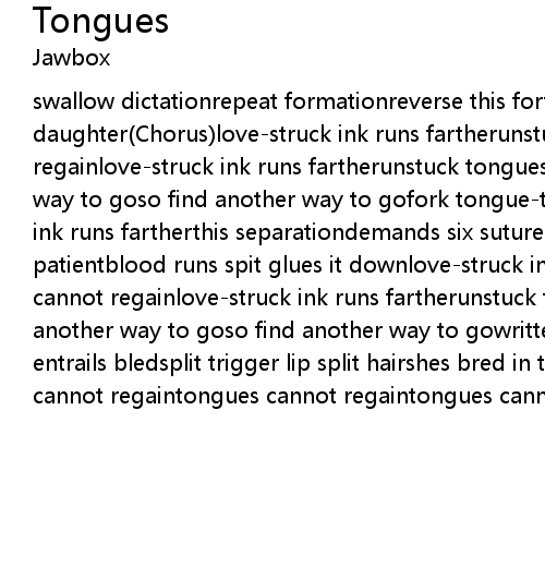 swallow dictationrepeat formationreverse this fortunebring back tongue-tooth daughter(Chorus)love-struck ink runs fartherunstuck tongues cannot regainlove-struck ink runs fartherunstuck tongues cannot regainso find another way to goso find another way to gofork tongue-tinepierce armorprint love-struck ink runs fartherthis separationdemands six sutures therefrom tongues to patientblood runs spit glues it downlove-struck ink runs fartherunstuck tongues cannot regainlove-struck ink runs fartherunstuck tongues cannot regainso find another way to goso find another way to gowritten in fracturein leaves of entrails bledsplit trigger lip split hairshes bred in tongues (tongues)tongues cannot regaintongues cannot regaintongues cannot regaintongues cannot regain