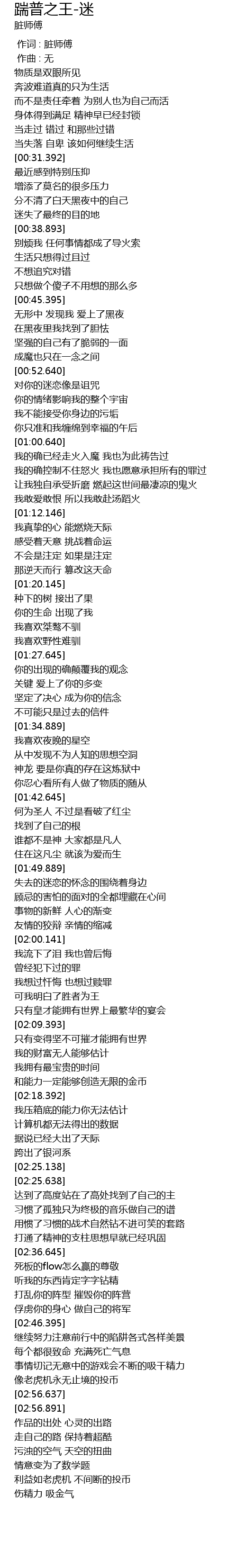 | [02:38.641] | 死板的flow怎么赢的尊敬 |