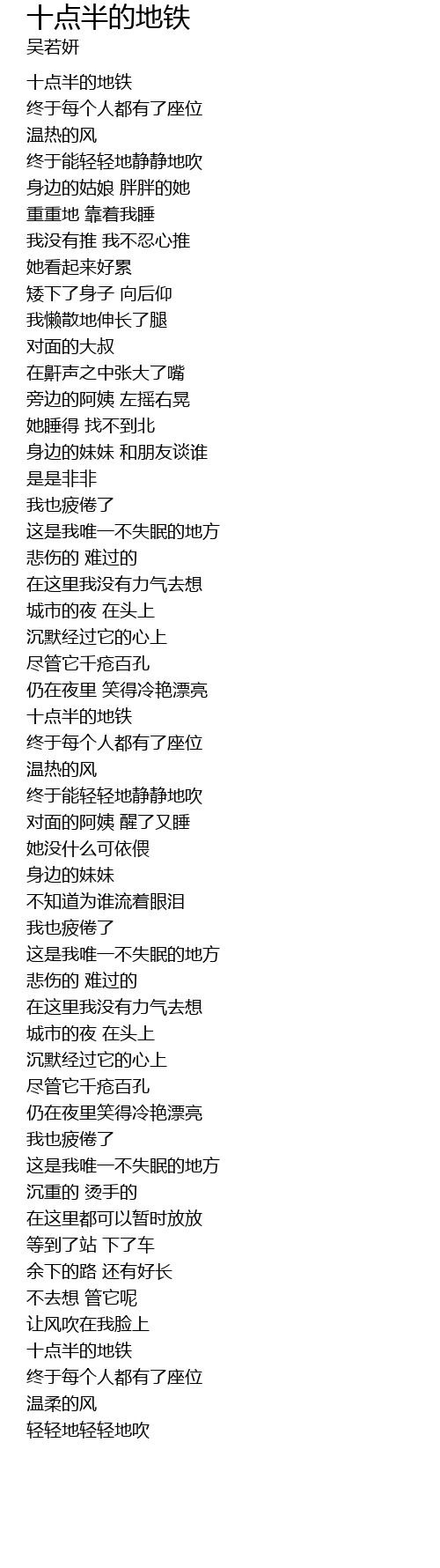 | [00:15.450] | shí diǎn bàn de dì tiě |