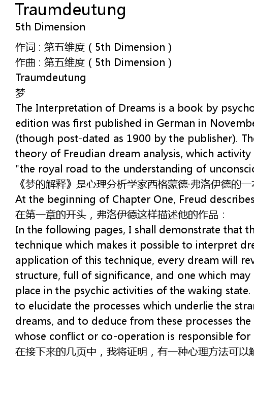 | meng de jie shi shi xin li fen xi xue jia xi ge meng de fu luo yi de de yi ben shu. di yi ban yu 1899 nian 11 yue yi de yi zhi bao Dietraumdeutung de xing shi shou ci yi de yu chu ban jin guan chu ban shang yu 1900 nian chu ban. zhe ben shu kai chuang le fu luo yi de meng fen xi li lun de xian he, fu luo yi de yi" li jie wu yi shi xin li guo cheng de huang jia zhi lu" zhu cheng. | |