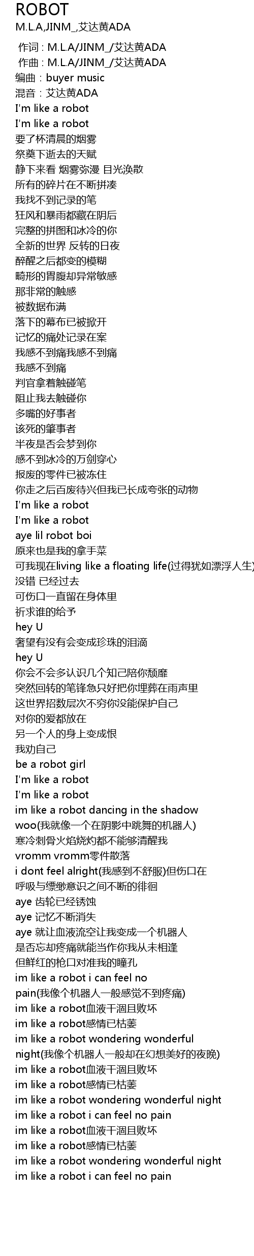 | [02:33.668] | im like a robot i can feel no pain wǒ xiàng gè jī qì rén yì bān gǎn jué bú dào téng tòng |
