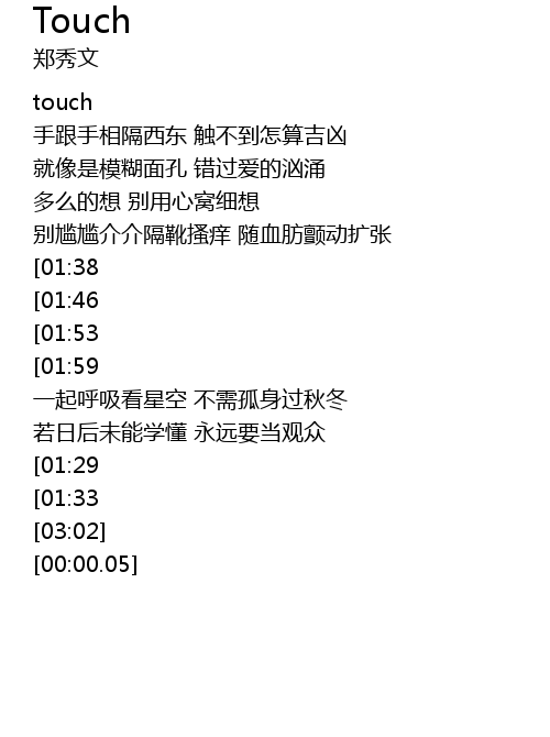 | [02:42][01:53][00:50] | touch wo de xin dong wo xin shi zhong shi zhong shi kong |