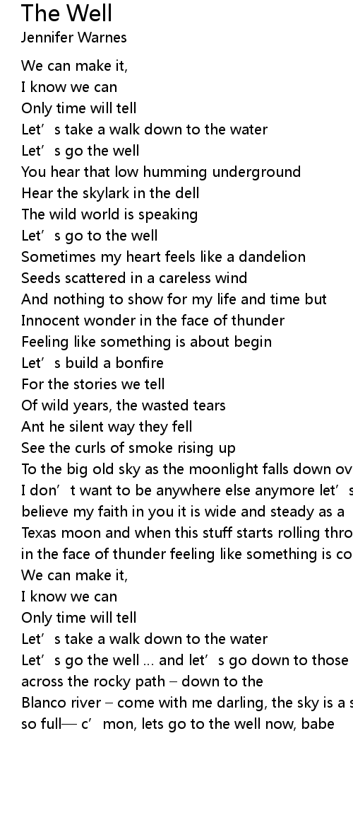 | I don' t want to be anywhere else anymore let' s go to the well you better believe my faith in you it is wide and steady as a | |