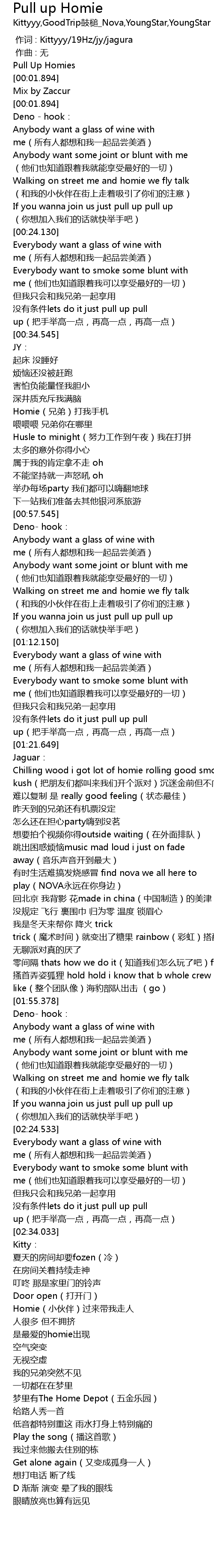 | [01:24.149] | Chilling wood i got lot of homie rolling good smoking kush bǎ péng yǒu men dōu jiào lái wǒ men kāi gè pài duì chén mí jīn qián dàn bù xiàng wǎng wù zhí |