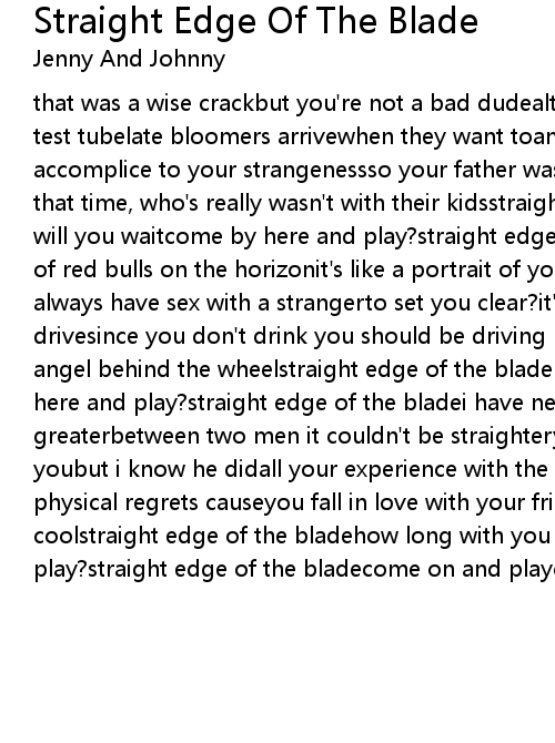 that was a wise crackbut you're not a bad dudealthough you make bedroom eyesat a test tubelate bloomers arrivewhen they want toand then they grow upshe's an accomplice to your strangenessso your father was emotionally restrainedbut at that time, who's really wasn't with their kidsstraight edge of the bladehow long will you waitcome by here and play?straight edge of the bladethere is a six pack of red bulls on the horizonit's like a portrait of your aggressionbut you'll always have sex with a strangerto set you clear?it's a real shame you don't drivesince you don't drink you should be driving me aroundas you know i'm an angel behind the wheelstraight edge of the bladehow long will i waitcome round here and play?straight edge of the bladei have never seen a love that was greaterbetween two men it couldn't be straighteryou don't know he betrayed youbut i know he didall your experience with the opposite sexonly led to physical regrets causeyou fall in love with your friendsbut you keep it coolstraight edge of the bladehow long with you waitcome by here and play?straight edge of the bladecome on and playcome out |