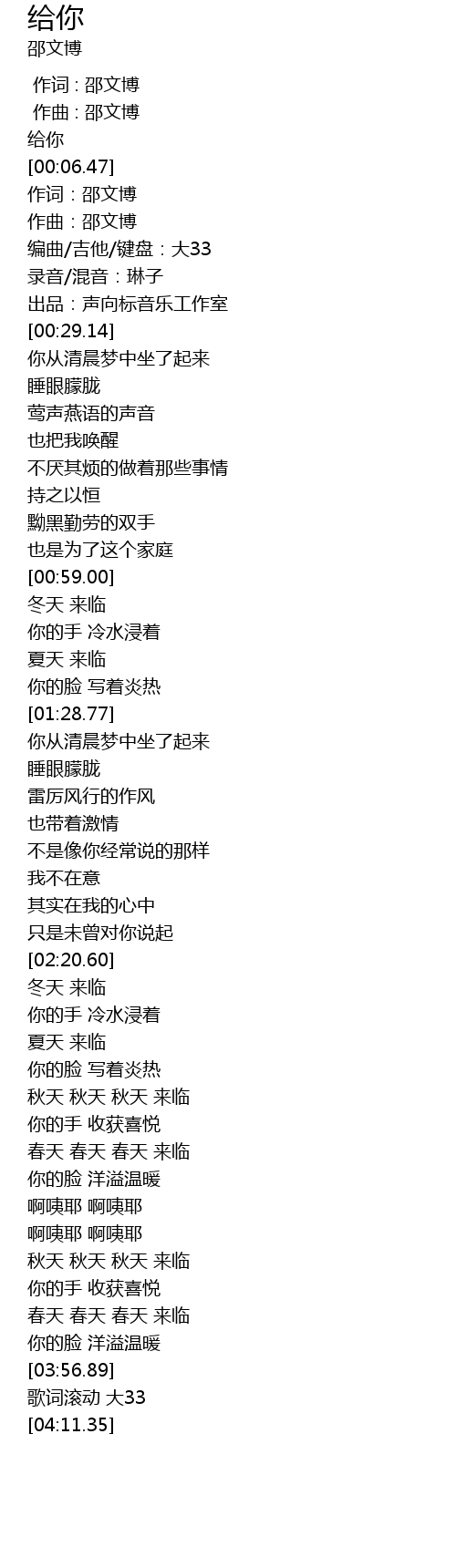 | [00:13.78] | 编曲/吉他/键盘:大33 |