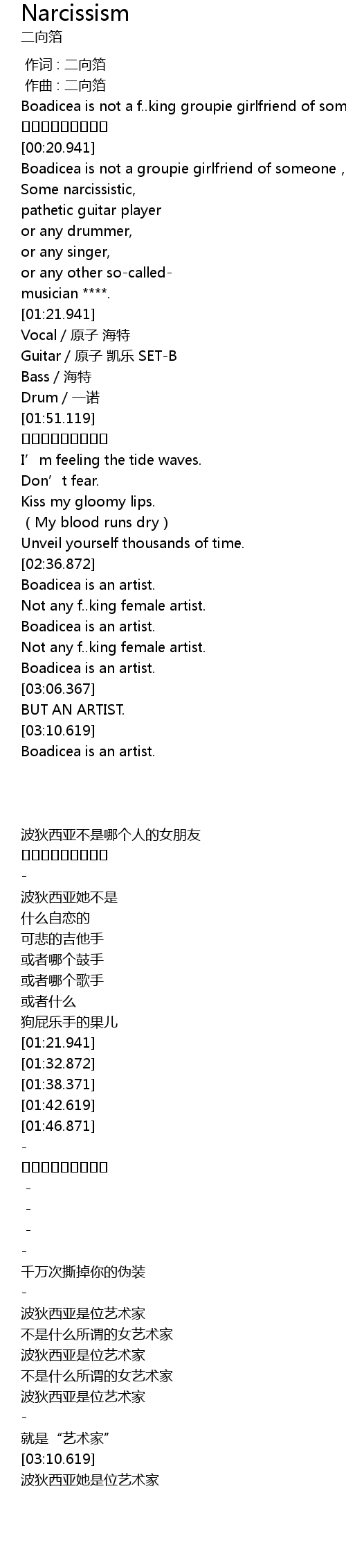 | [00:05.691] | Boadicea is not a f.. king groupie girlfriend of someone |
