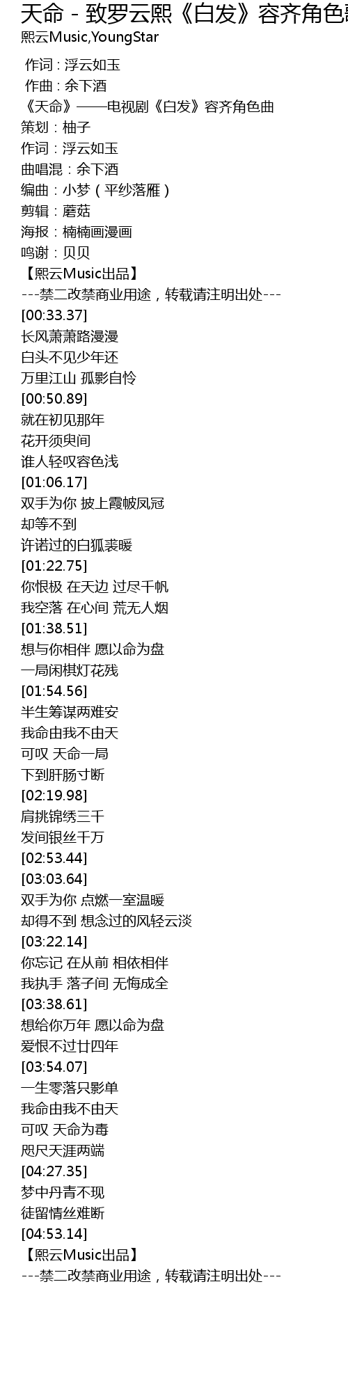 | [00:05.760] | 《天命》——电视剧《白发》容齐角色曲 |