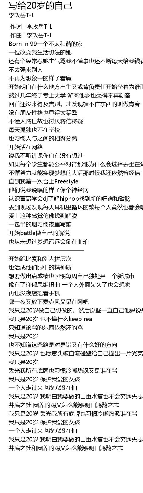 | [02:12.272] | 我只是20岁 也不懂什么keep real 只知道该骂的东西依然还的骂 |